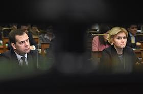Председатель правительства России Дмитрий Медведев (слева) и его заместитель Ольга Голодец (справа)…