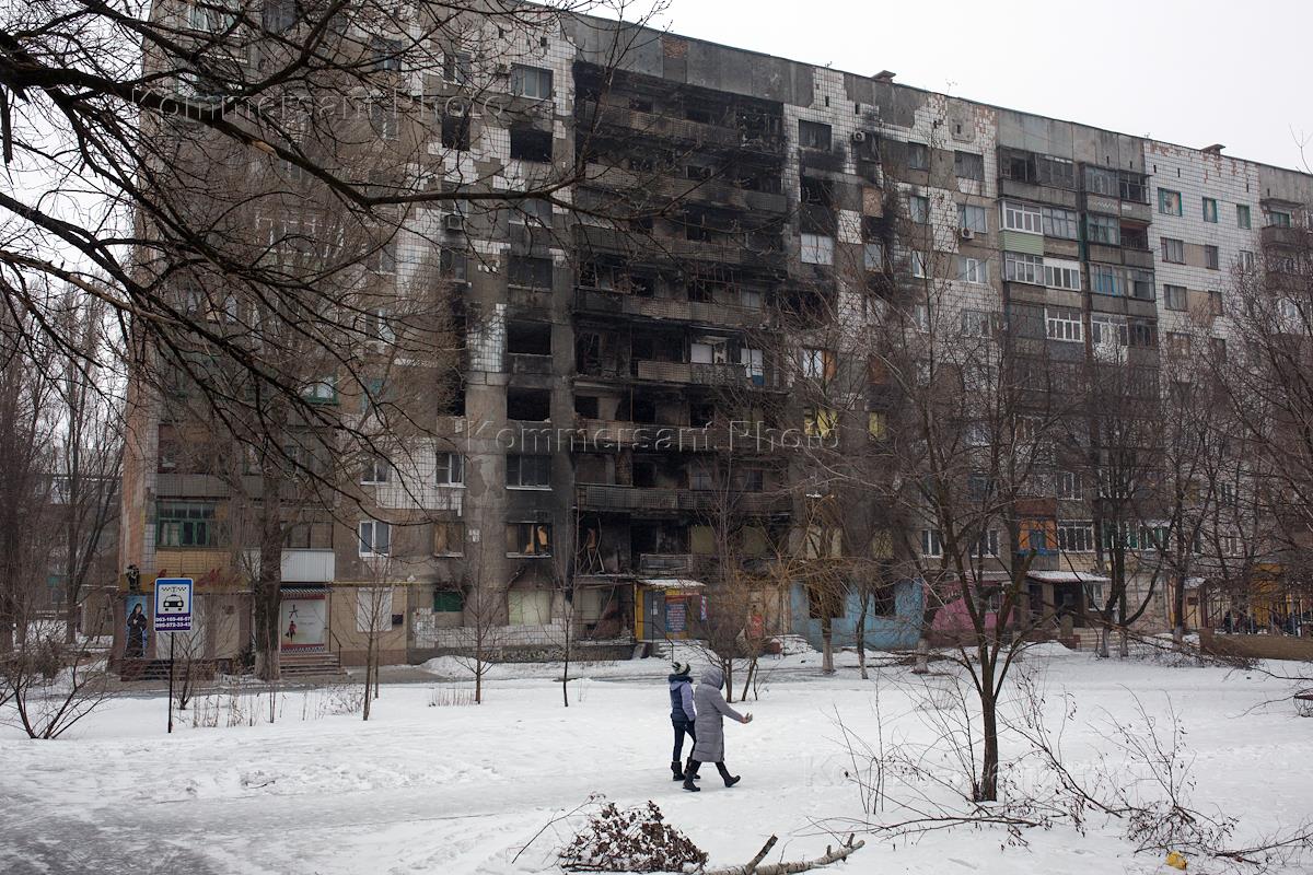 Многоэтахный жилой дом пострадавший от обстрела в результате проведения АТО в городе Шахтерске.