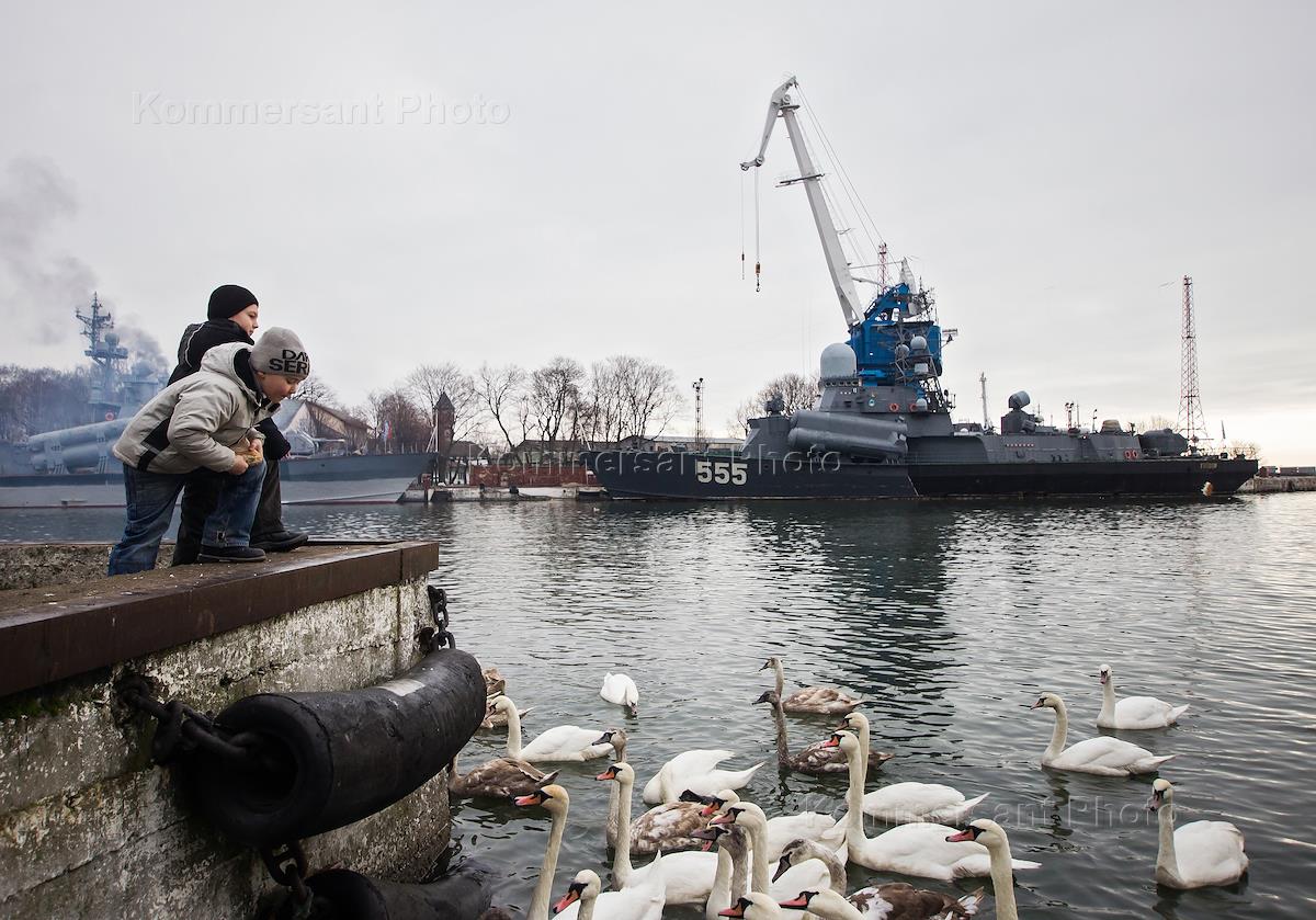 Жанровая фотография. Зимовка лебедей в военной гавани города Балтийска.