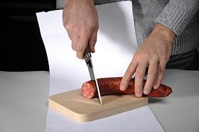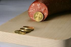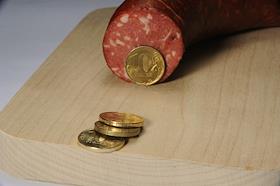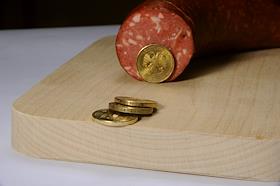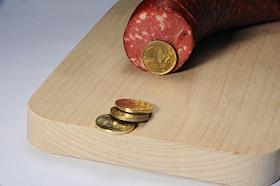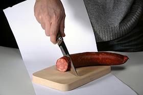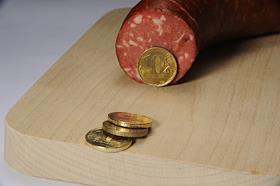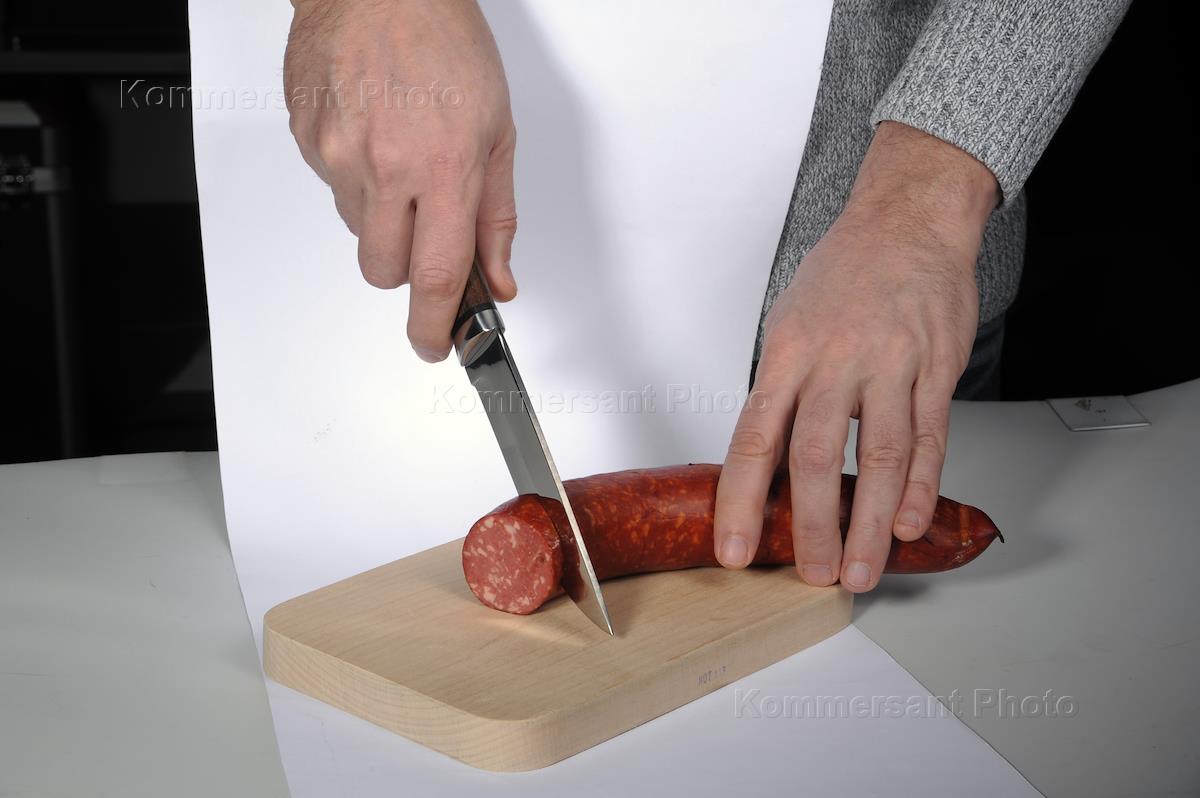 Обложка для журнала "Деньги". Батон колбасы режут на кусочки на разделочной доске.
