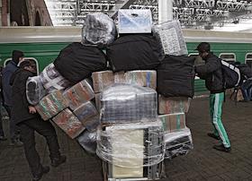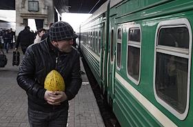 Жанровая фотография. Пассажиры перед отправлением поезда Москва - Душанбе на Казанском вокзале.
