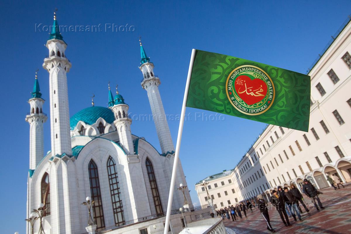 Акция "Я люблю пророка" в мечети Кул Шариф. Сотрудник полиции держит флажок участника акции.