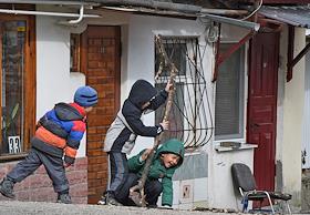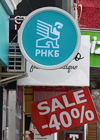 Жанровая фотография. Эмблема Российского национального коммерческого банка (РНКБ) и объявление о…