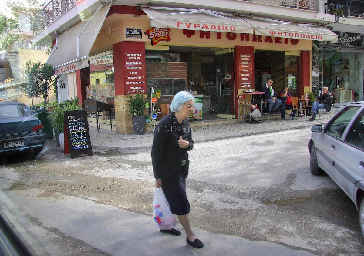 Виды Салоники. Пожилая женщина на улице города. Уличное кафе.