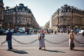 Виды Парижа. Жанровая фотография. Люди стоят у столбов с цепями ограждения дороги.