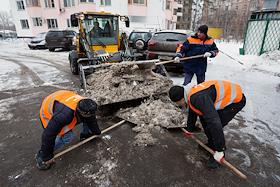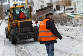 Снегопад в Москве. Сотрудники коммунальной службы чистят снег на улицах города.