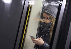 Девушка в поезде на станции метро "Бауманская" Арбатско-Покровской линии метрополитена.
