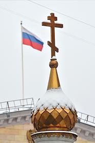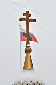 Жанровая фотография. Крест на куполе храма на фоне национального флага России.