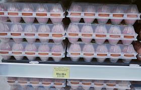 Жанровая фотография. Супермаркет "Я Любимый". Контейнеры с куриными яйцами на полке в магазине.