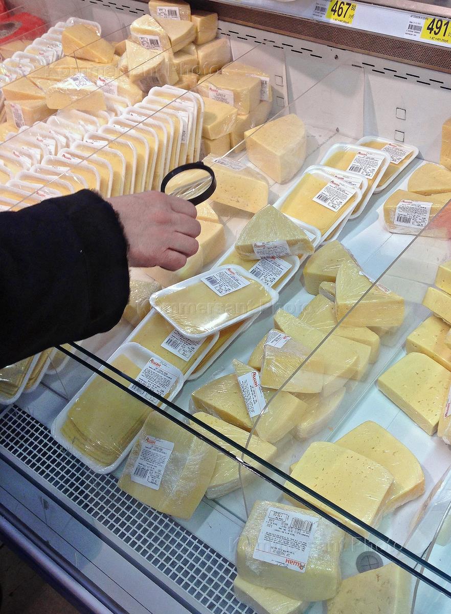 Жанровая фотография. Покупатель с лупой у витрины с сырами в сетевом магазине "Ашан".
