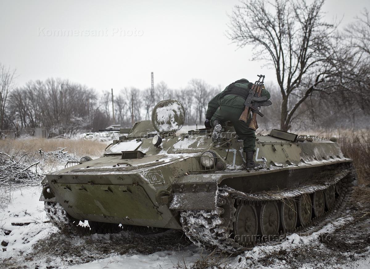 Ополченцы на БМП у перевалочной базы армии ДНР на шахте Кондратьевка в городе Горловка.