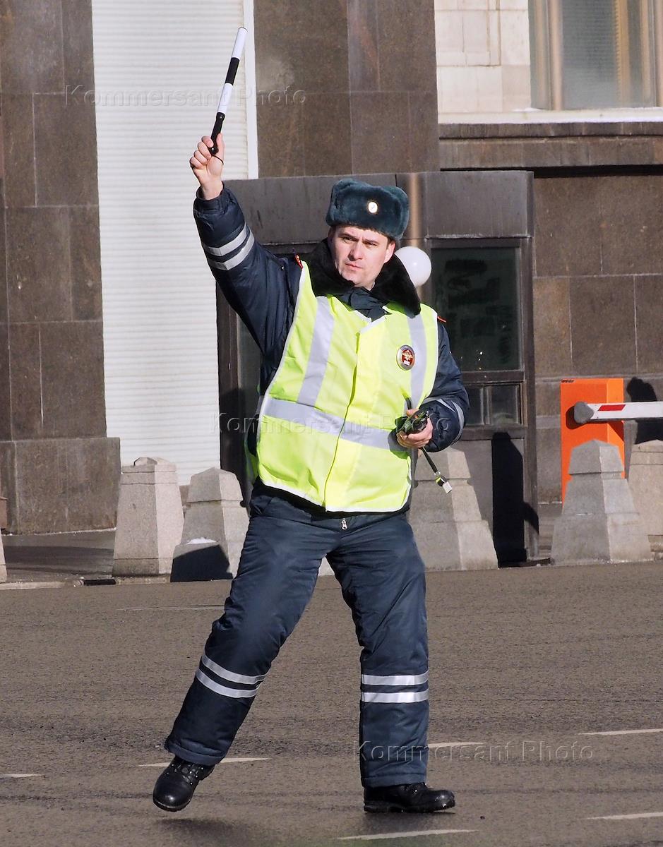 Жанровая фотография. Сотрудник дорожно-патрульной службы (ДПС) останавливает автомобиль.