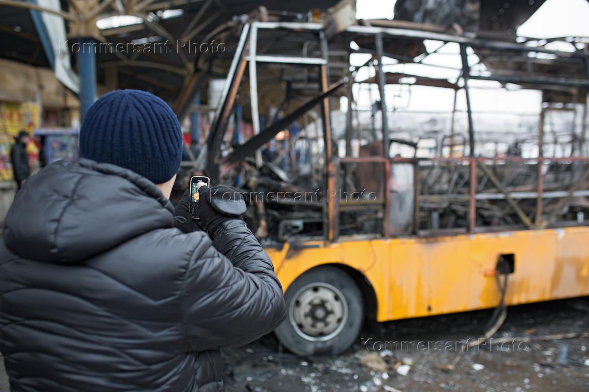 Последствия попадания артеллеристского снаряда на автостанцию "Центр", в результате которой 3…