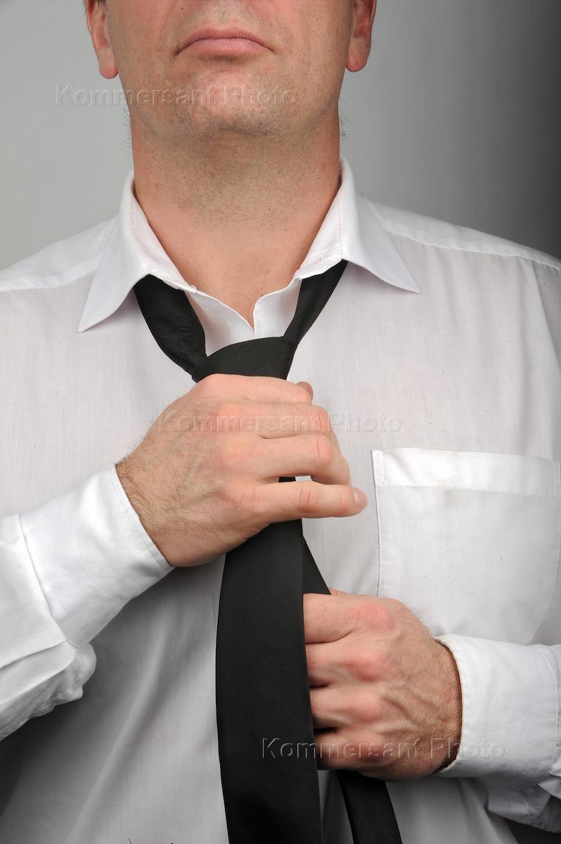 Обложка для журнала "Деньги". Мужчина поправляет галстук.