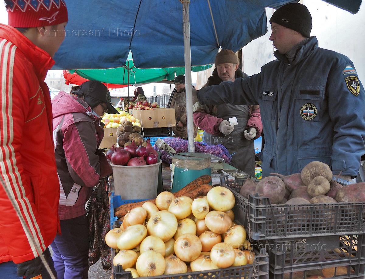 Коптевский колхозный рынок. Продавец у торговой лотка с овощами.