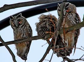 Жанровая фотография. Московский парк Победу. Совы спят на ветках деревьев в дневное время.