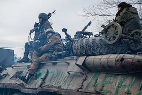 Политическая обстановка в Донецкой области. Ополченцы в маскировочной форме с автоматами на башне…
