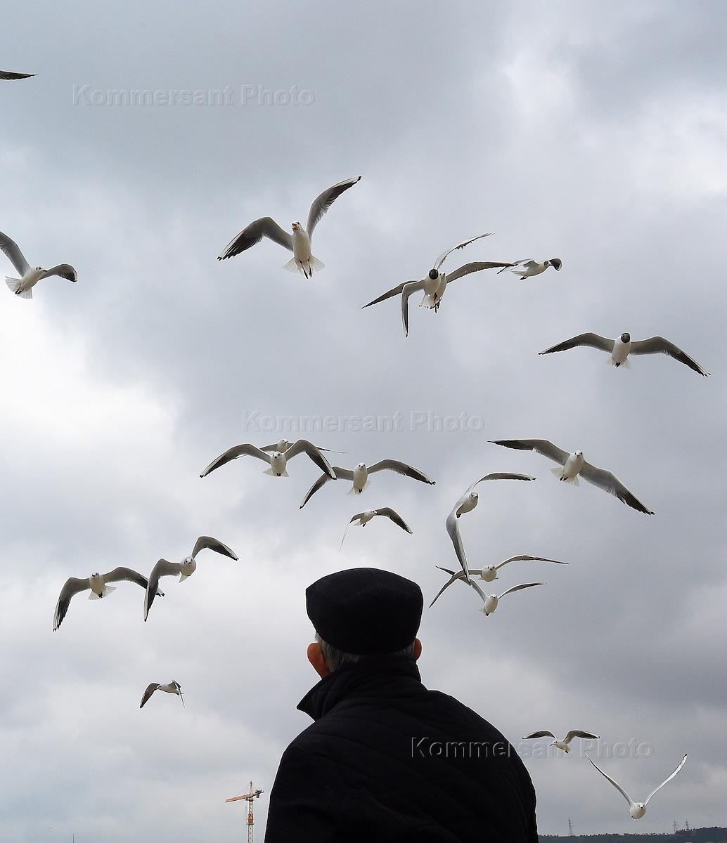 Жанровая фотография. Мужчина кормит чаек на набережной Баку.