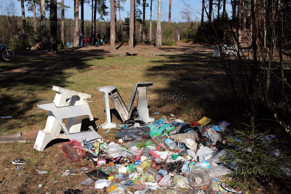Мусор, оставленный после проведения корпоративного мероприятия в зоне отдыха на пляже озера Большое Барково.