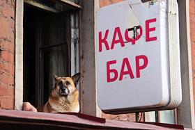 Жанровая фотография. Собака породы овчарка лежит на подоконнике рядом с вывеской "Кафе Бар".