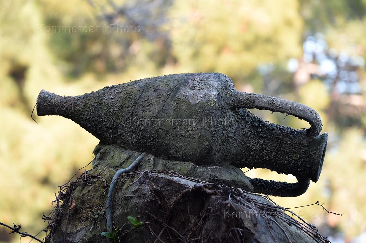 Жанровая фотография. Глиняная амфора, покрытая землей и мхом.