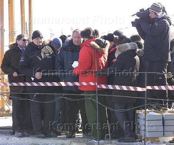 Заместитель председателя правительства России Дмитрий Рогозин (в центре) на космодроме "Восточный".