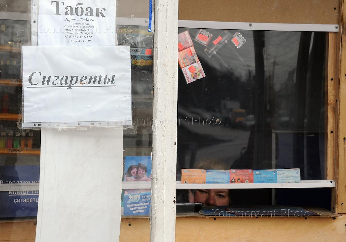 Жанровая фотография. Продавец в палатке с рекламой табачных изделий.