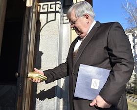 Посол США в России Джон Теффт у входа в здание издательского дома "Коммерсантъ".