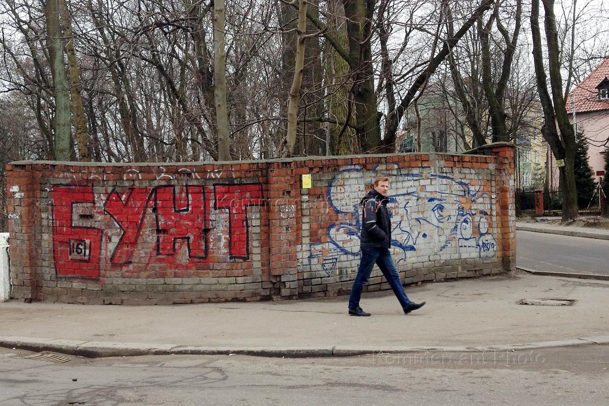 Жанровая съемка. Виды Калининграда: улица Брамса, на стене надпись "Бунт" и так же на столбе рекламная вывеска "деньги".
