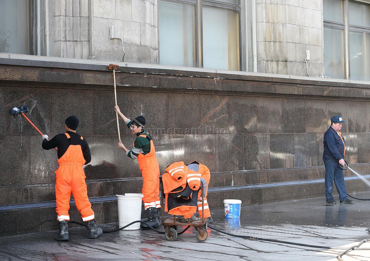 Жанровая фотография. Сотрудники коммунальных служб города во время мытья стен зданий в центре города.