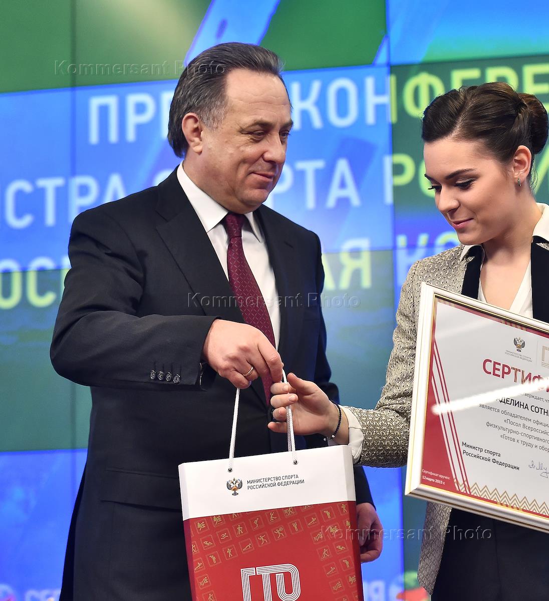 Министр спорта России Виталий Мутко (слева) и фигуристка, олимпийская чемпионка Аделина Сотникова…