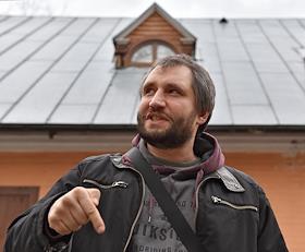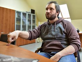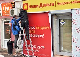 Жанровая фотография. Рабочие вещают рекламный плакат в витрину офиса компании по экспресс-займам…
