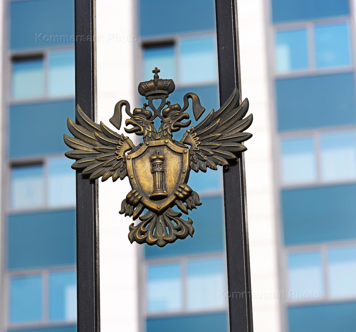 Жанровая фотография. Эмблема прокуратуры России на решетке заборе у нового здания прокуратуры Москвы…