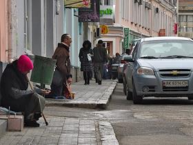 Жанровая фотография. Мужчина и пожилая женщина просят милостыню на улице города.