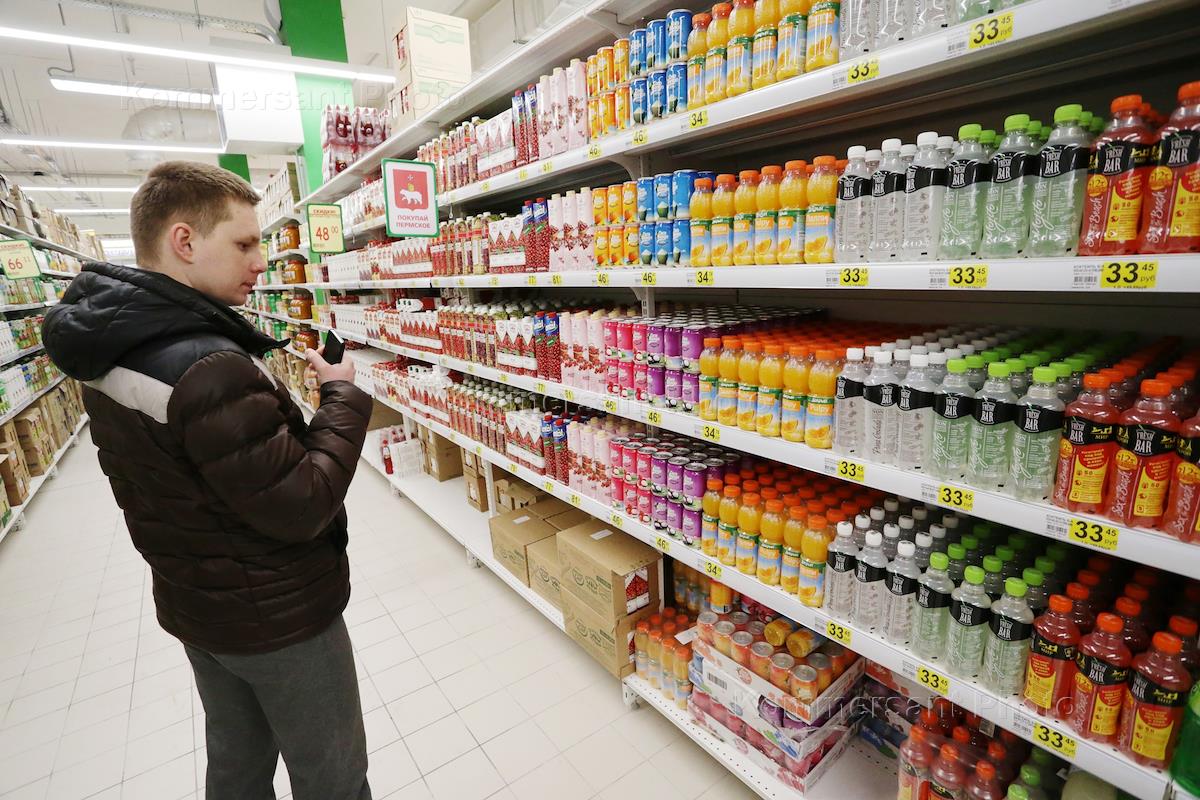 Церемония открытия супермаркета сети "Ашан" в Перми. Покупатель в отделе "Соки".