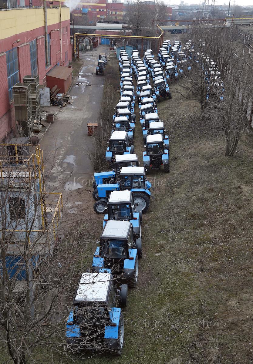 Жанровая фотография. Минский тракторный завод (МТЗ). Тракторы - готовая продукция - на стоянке на…