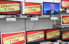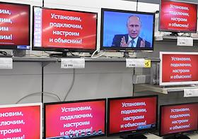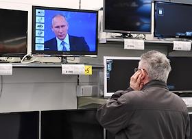 Традиционная прямая линия президента Владимира Путина на экранах телевизоров в магазине "М.Видео".