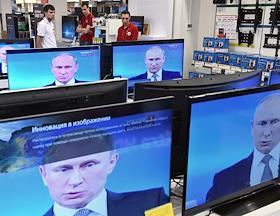 Трансляция традиционной Прямой линии президента России Владимира Путина на экранах телевизоров в…