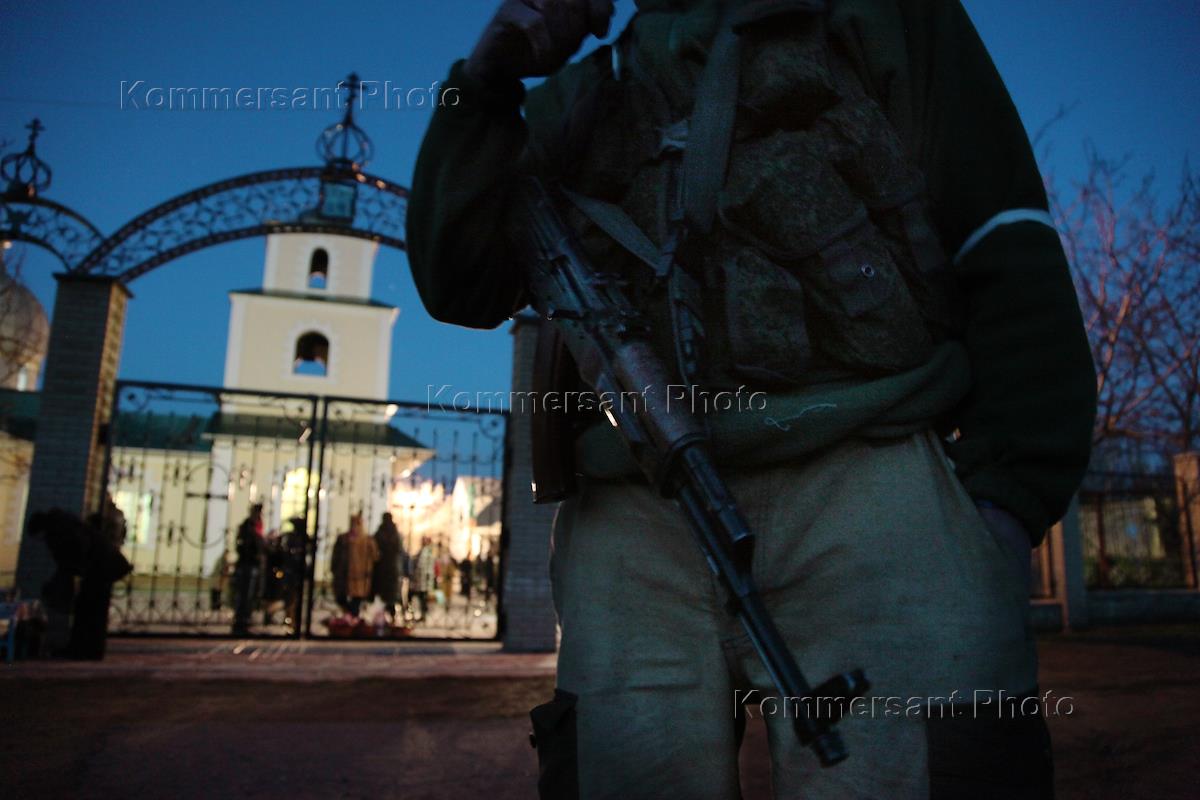 Жанровые фотографии. Луганская Народная Республика. Военный патруль Новороссии у православного Храма…