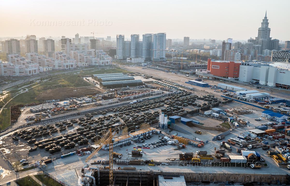 Ходынское поле. Вид с высоты на военную технику, выстроившуюся перед репетицией Парада Победы.