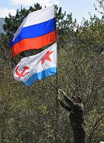 Жанровая фотография. Мужчина укрепляет на шесте флаги России и Военно-Морского Флота (ВМФ) СССР.