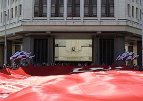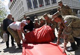Общество Копию Знамени Победы площадью 700 квадратных метров развернули в Симферополе у стен крымского парламента возле памятника воинам-освободителям, которые весной 1944 года освобождали полуостров от немецко-фашистских захватчиков.