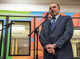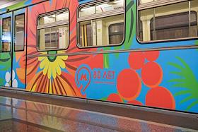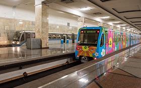 Экономика и бизнес Именной поезд "Краски метро", украшенный эскизом победителя конкурса, запуск которого приурочен к 80-летию Московского метрополитена.