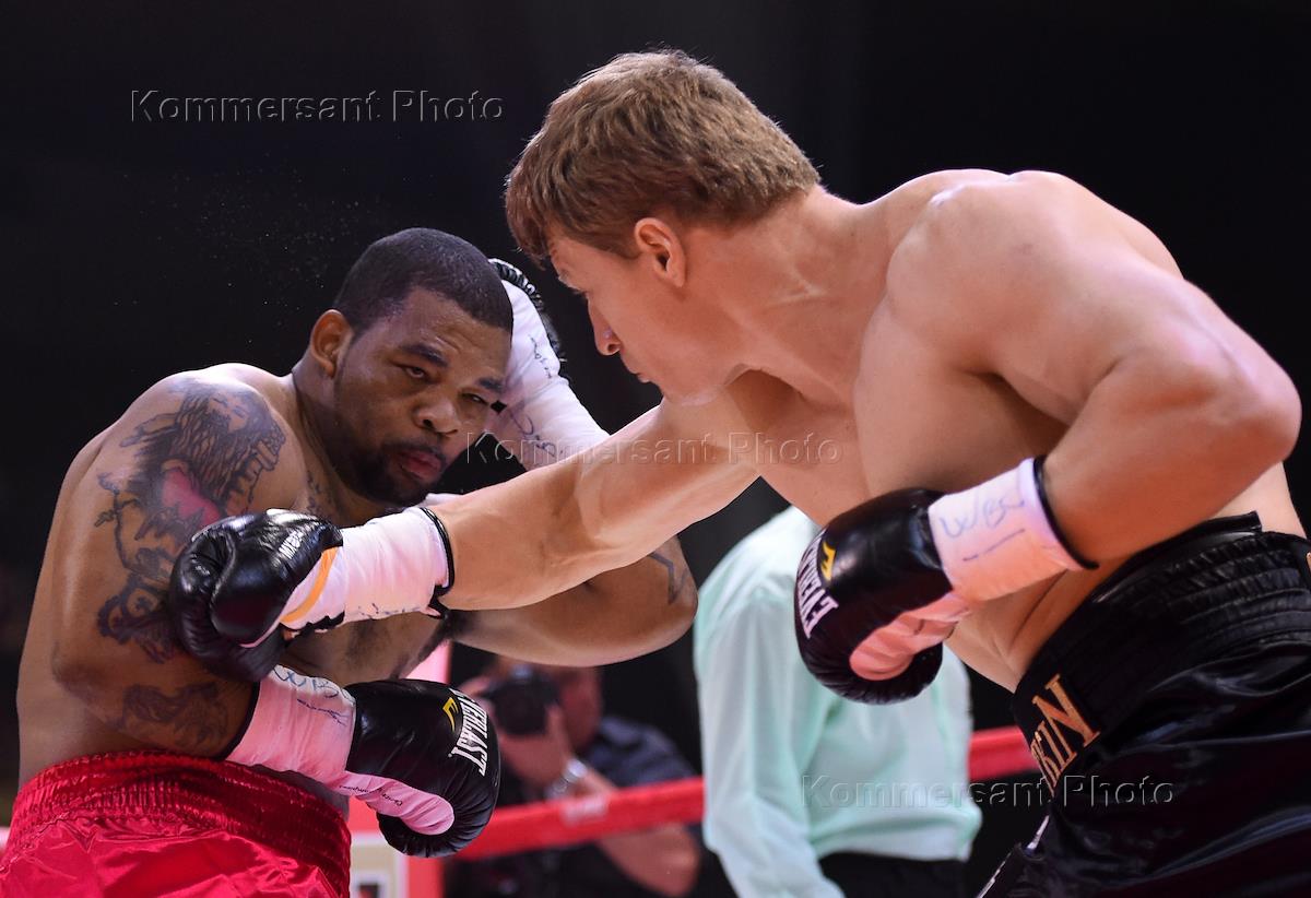 Боксерское шоу в ГЦКЗ "Россия" в "Лужниках". Российский боксер Рахим Чахкиев (справа) и американский…