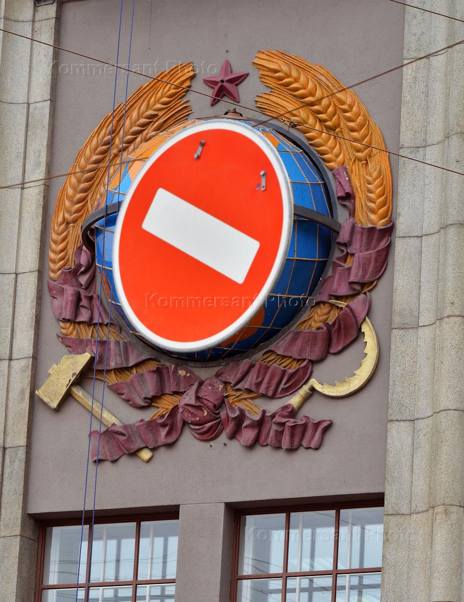 Жанровая фотография. Дорожный знак "Проезд запрещен" (Кирпич) на фоне герба Советского Союза на…