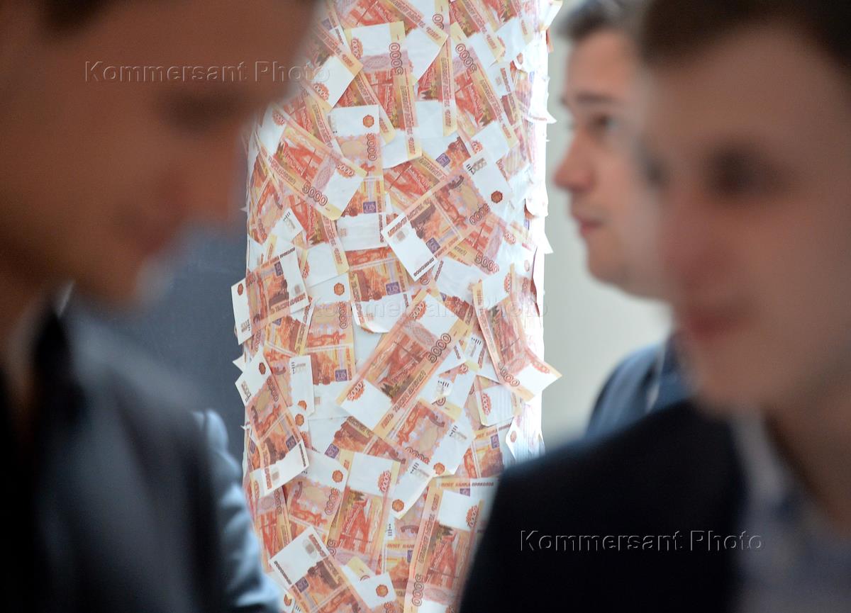 Жанровая фотография. Колонна, обклеенная пятитысячными купюрами. Московский международный…
