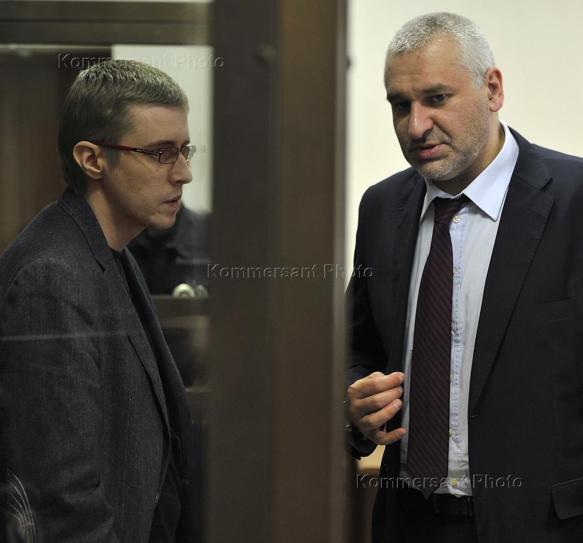 Член "Боевой организации русских националистов" (БОРН) Илья Горячев (слева) во время заседания суда…