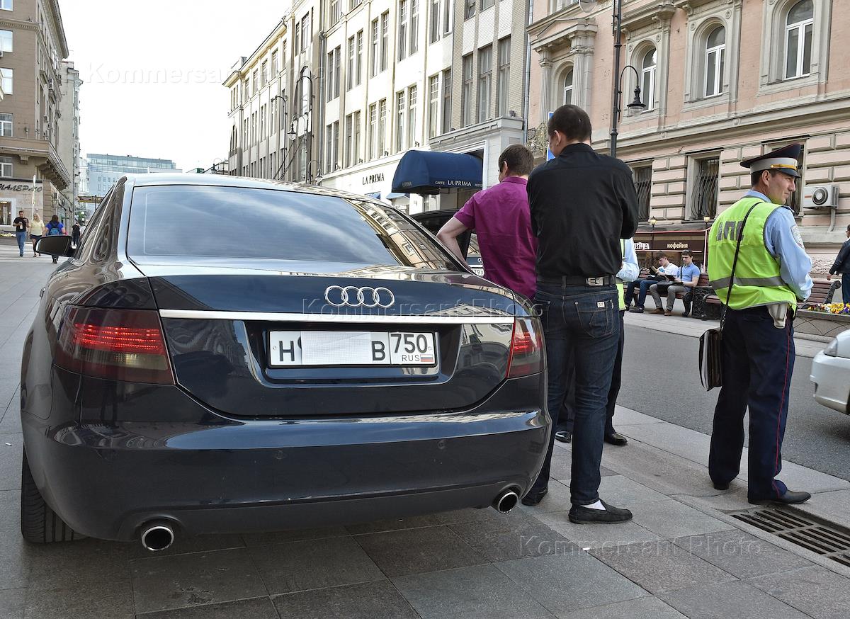 Жанровая фотография. Автомобиль на улице с закрытым номером рядом с сотрудником полиции.