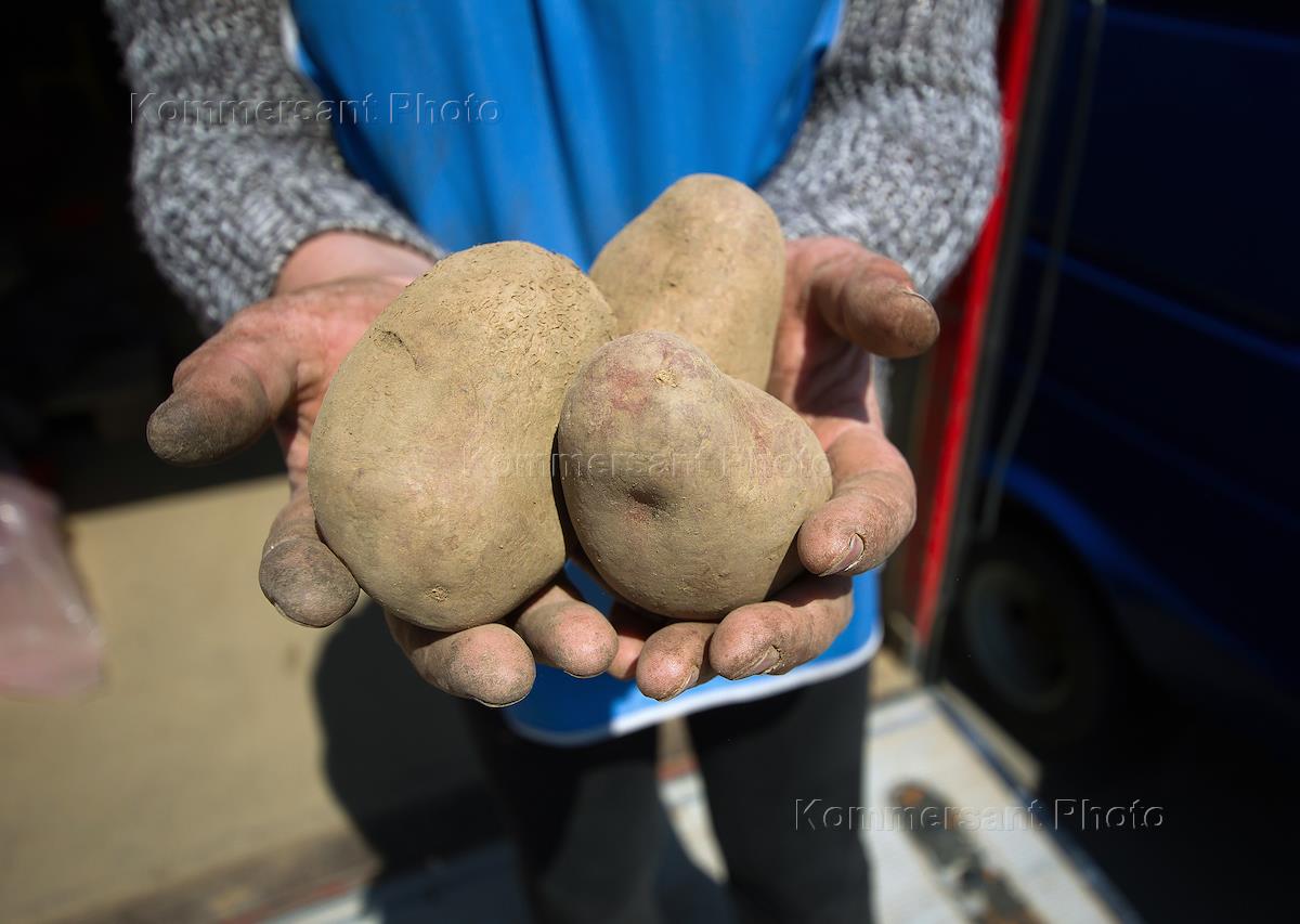 Колхозный рынок местных производителей в центре города. Женщина продает картофель.