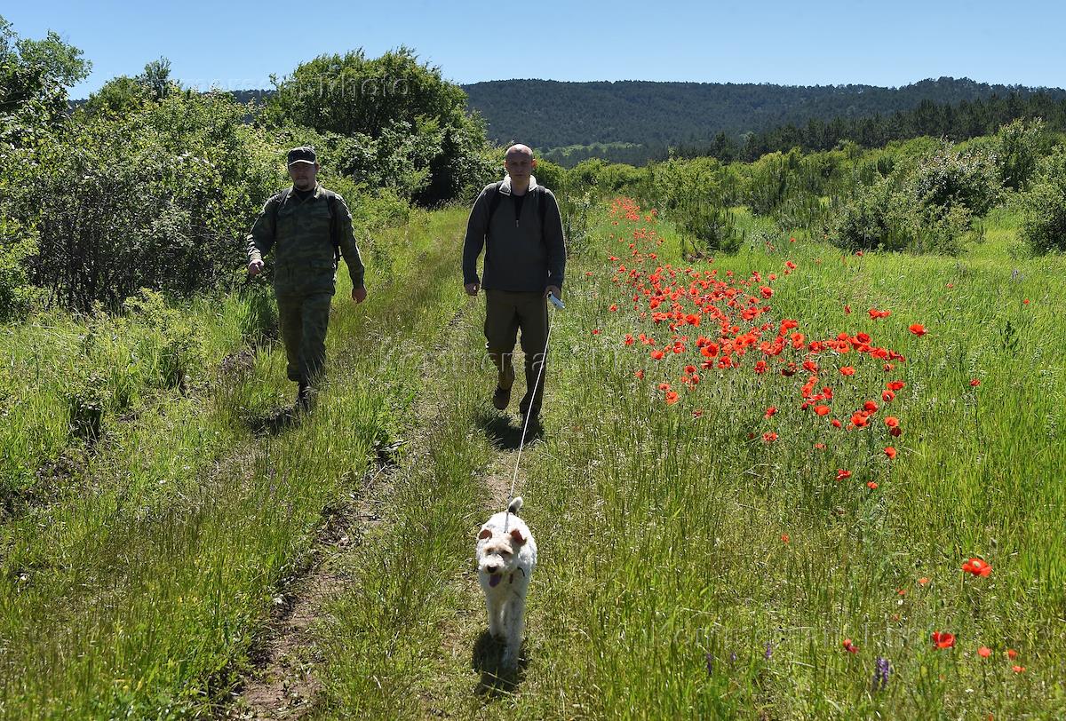 Жанровая фотография. Собака породы фокстерьер Нюра вместе с проводниками во время поиска в лесу…
